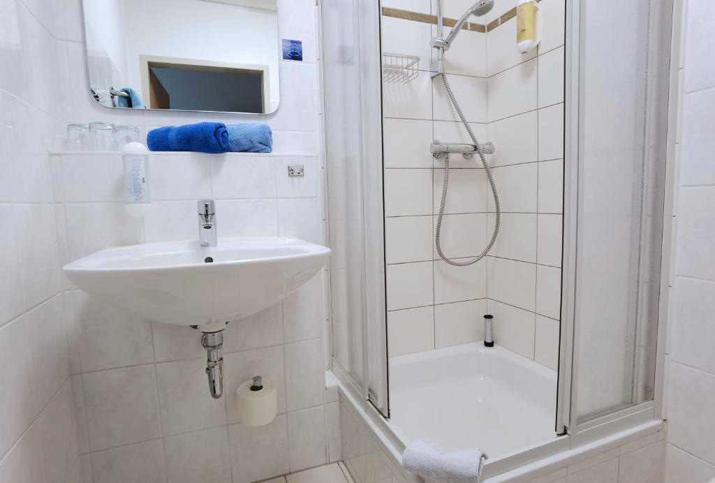 Das Doppelzimmer verfügt über eine eigene Sanitärzelle mit Du/WC und Waschbecken.