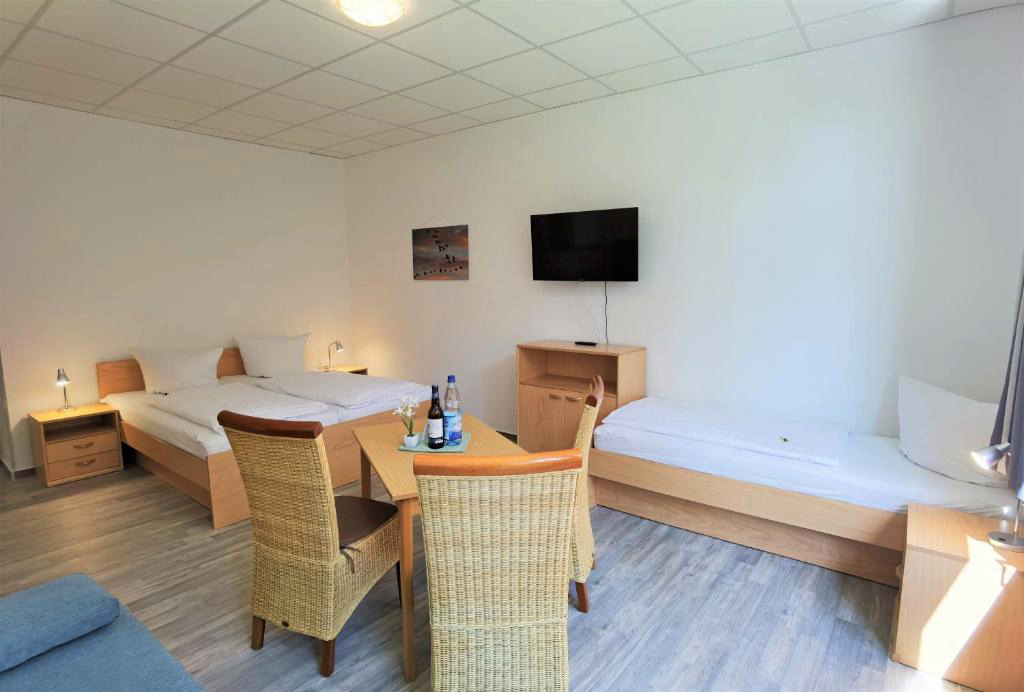 Die Dreibettzimmer sind zwischen 25-30 m² groß und bieten Platz für bis zu 3 Erwachsene – Familien mit 1 Kind und einem 2. Kind im Aufbett