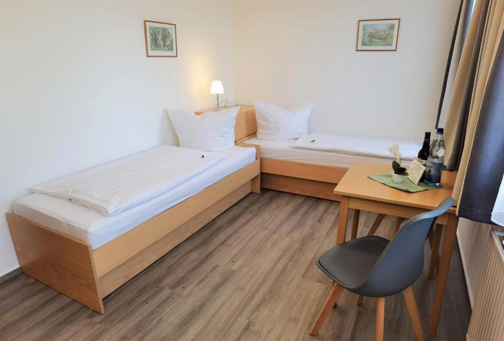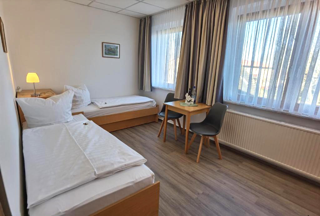 Zwei separat stehnde Einzelbetten, Tisch und Stühle.
